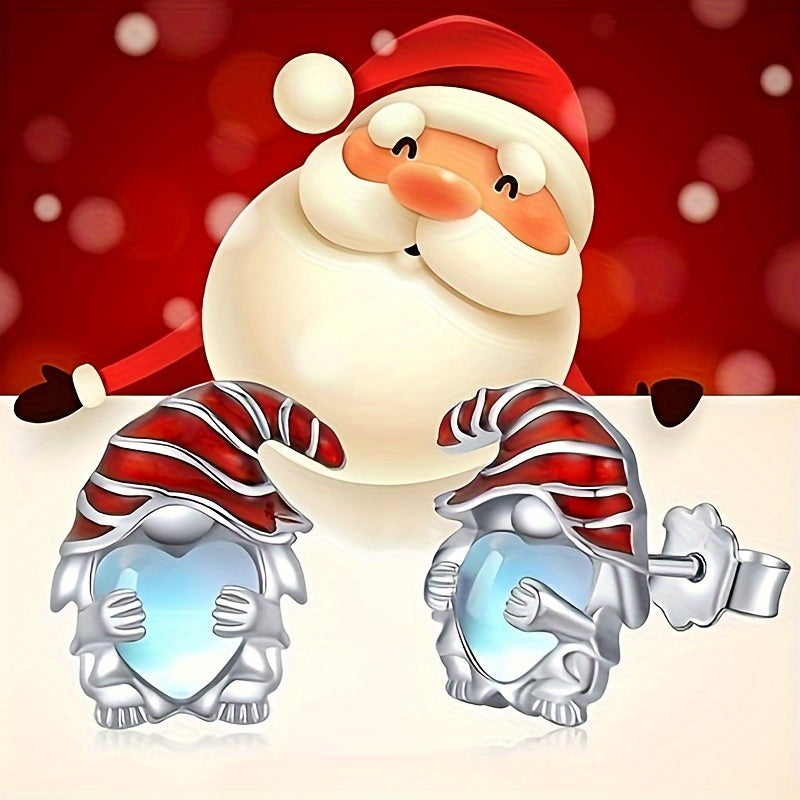 Ladies Lovely Heart Shaped Christmas Gnome Earrings - Synthetic Moonstone, Copper Sticker, Nickel Free, Everyday & Party Wear, June Birthstone, Christmas Holiday Gift Jewelry