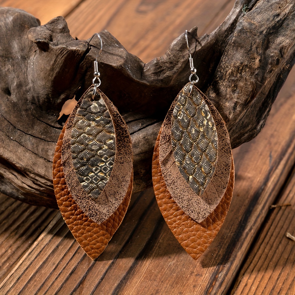 Layered Leaf Design PU Leather Drop Earrings, Rustic Vintage Style, Stylish Drop Ladies Earrings, Fall Inspiration Palette