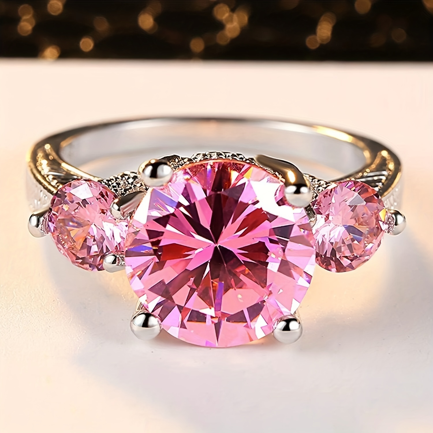 Luxury Women's Pink Stone Ring Glamour Silver Women's Wedding Ring Large Round Zirconia Engagement Ring