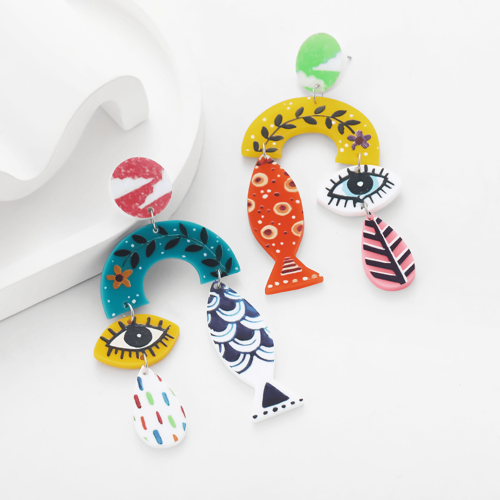 New Acrylic Stud Earrings European and American Personalized Fish Eye Leaf Printing Retro Earrings