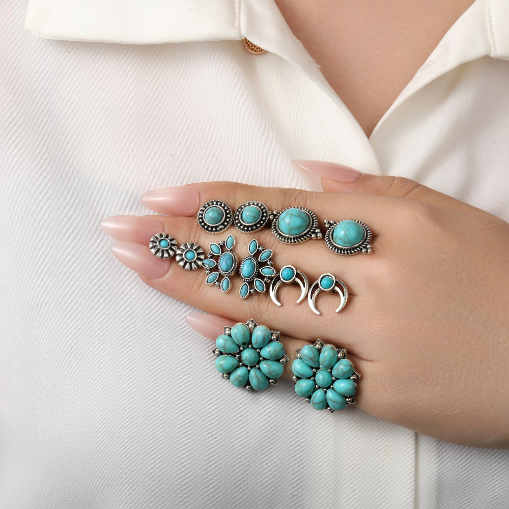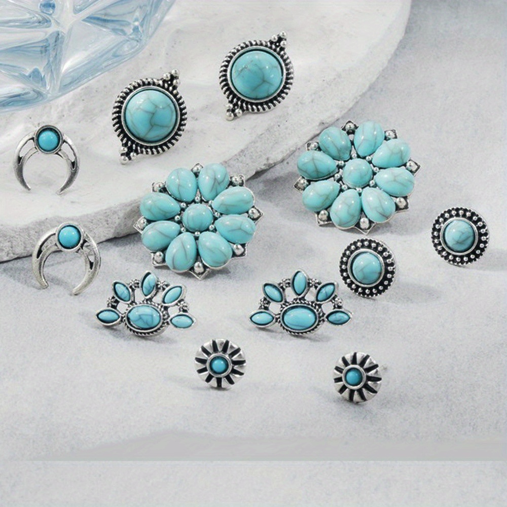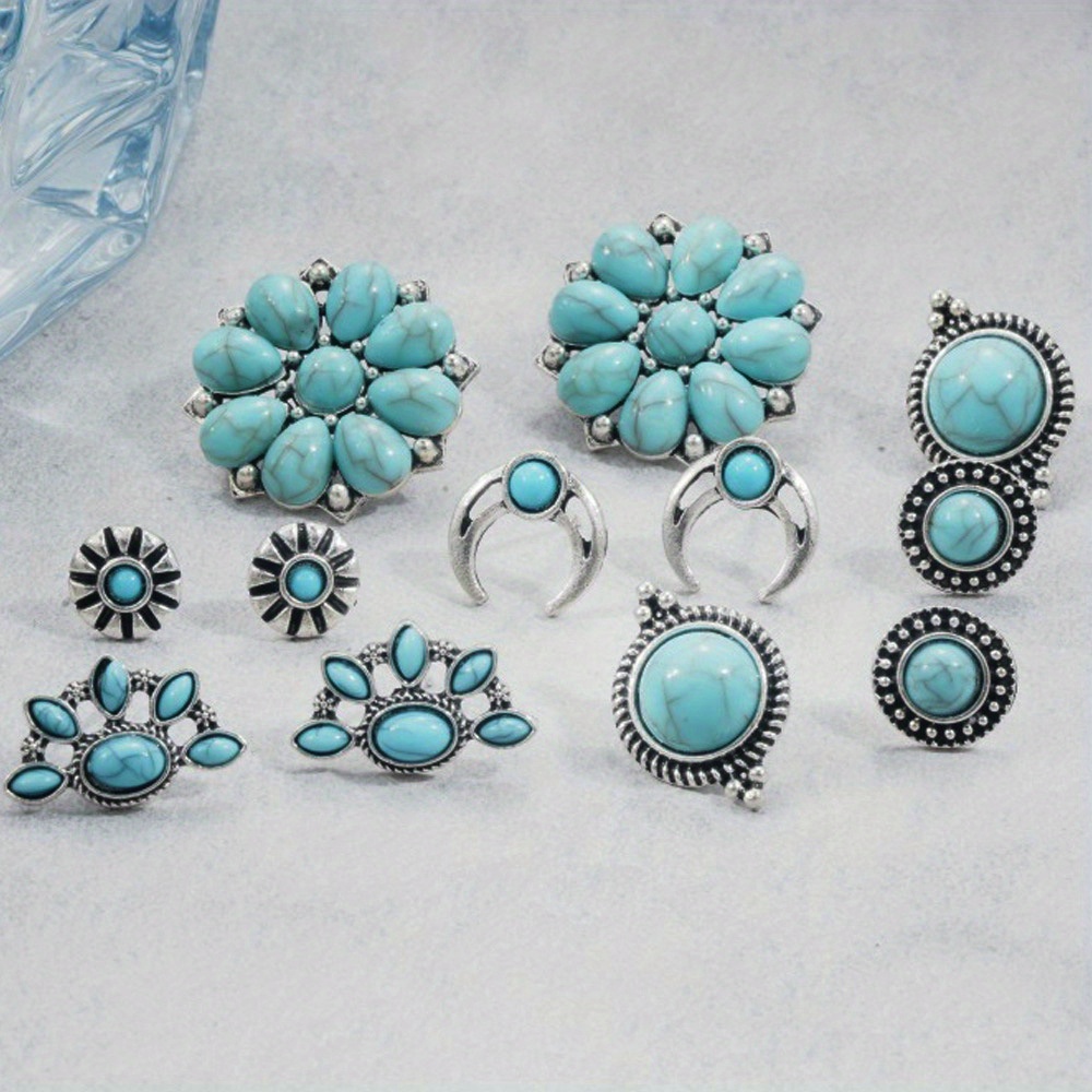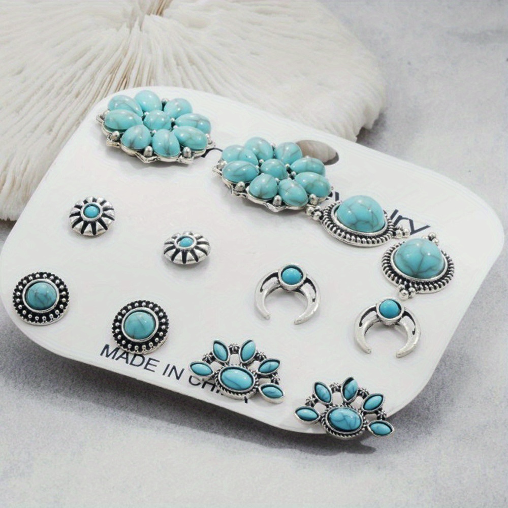 New, Vintage Bohemian Turquoise Floral Geometric Round Earrings 6 Pairs Suit Women