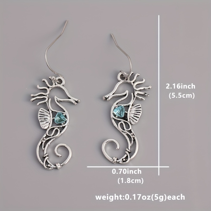 Ocean Blue Stone Hook Drop Earrings with Seahorse Animal Vintage Metal Design Ladies
