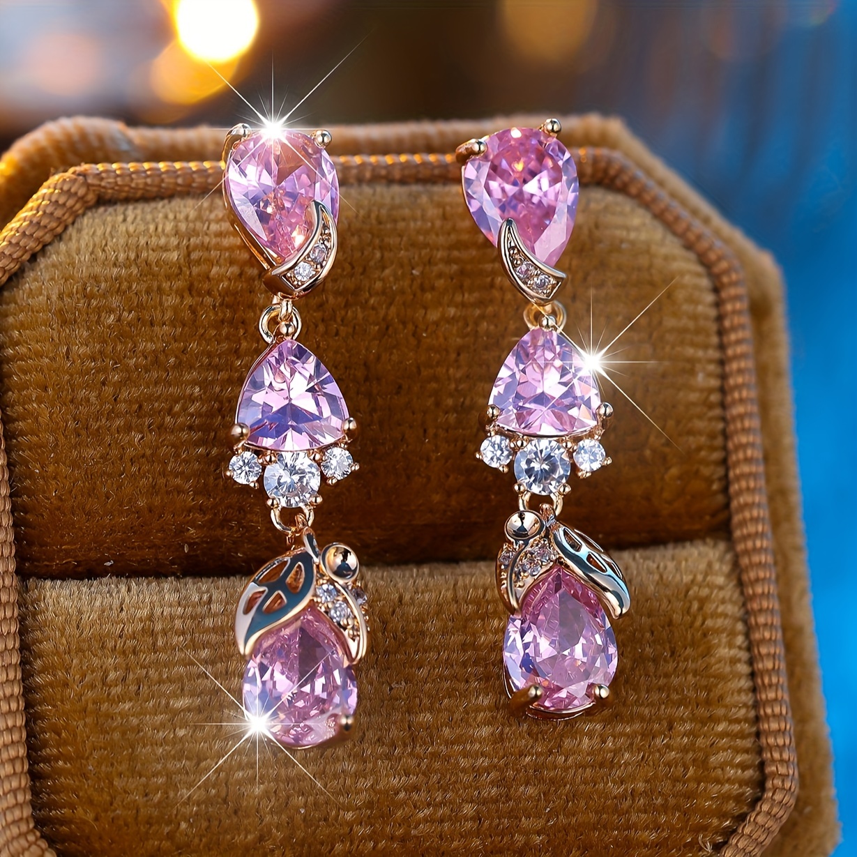 Pink sparkling Zirconia long fringed earrings, elegant luxury style, copper jewelry banquet wedding accessories