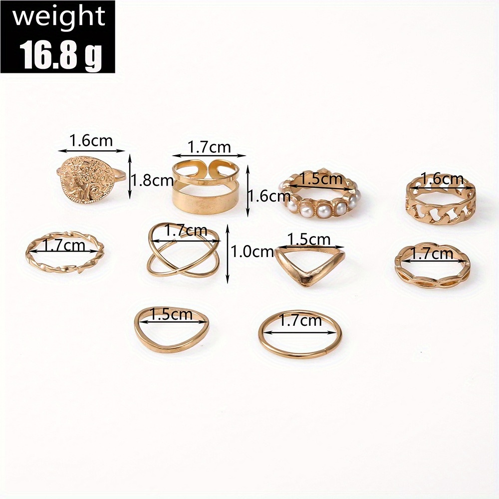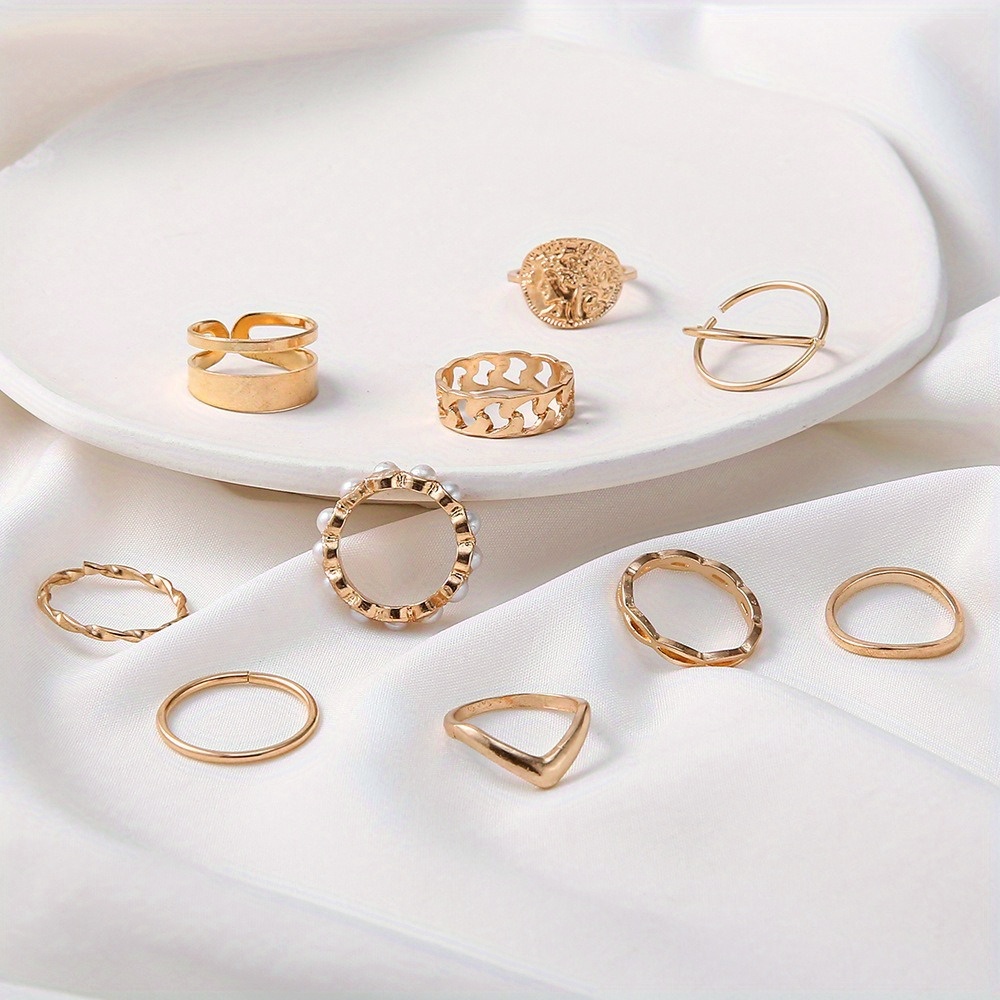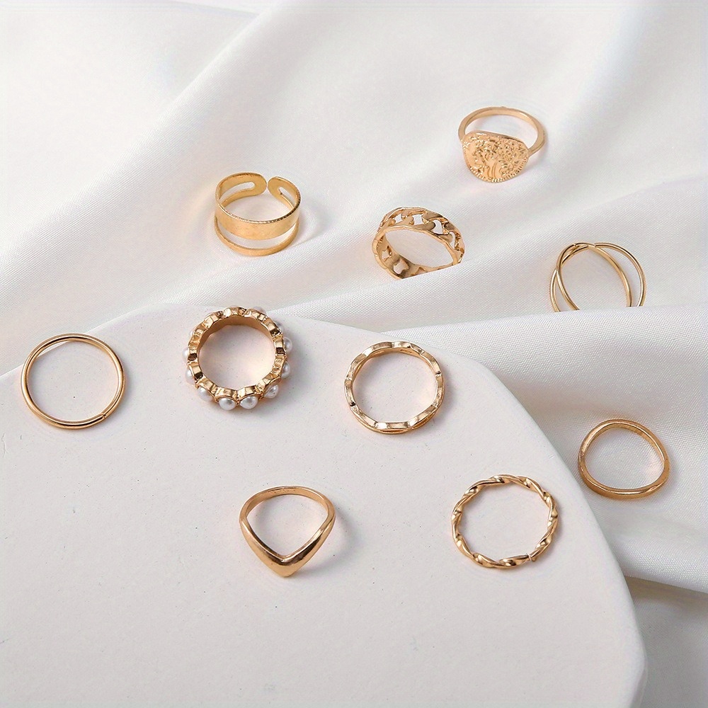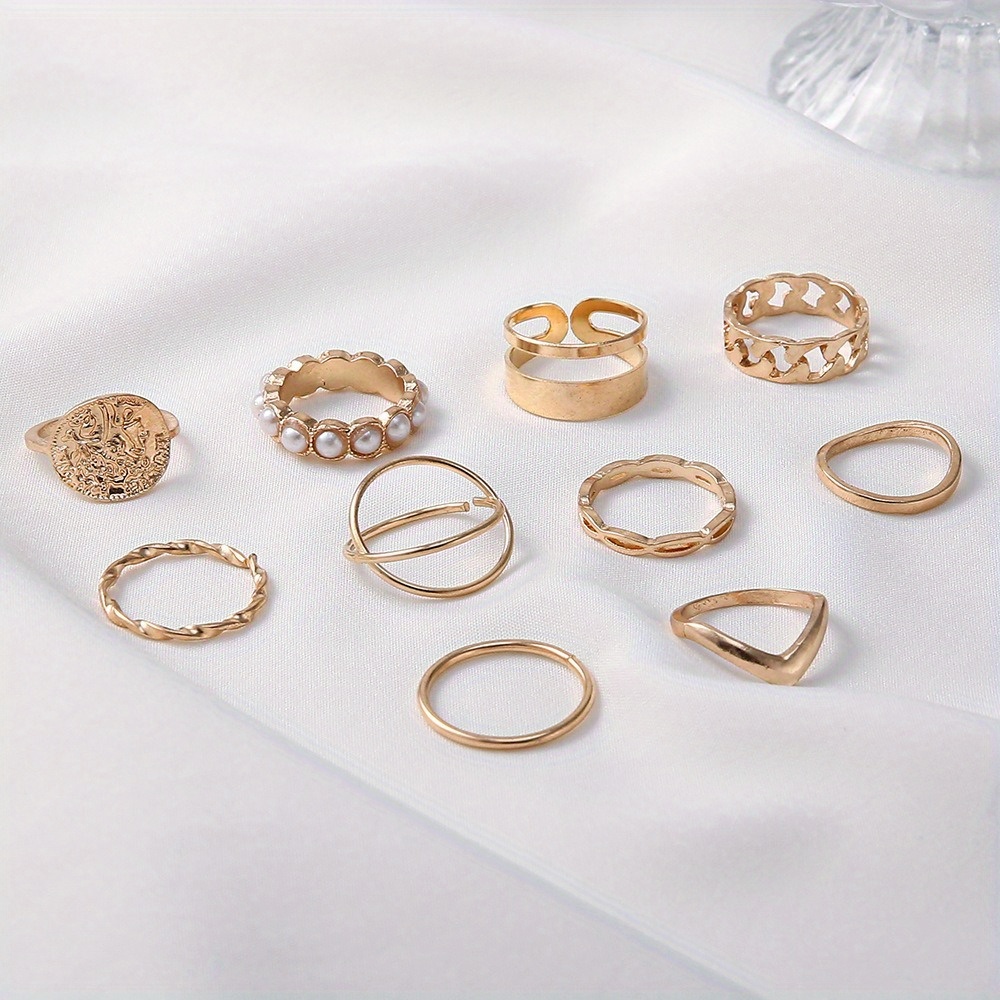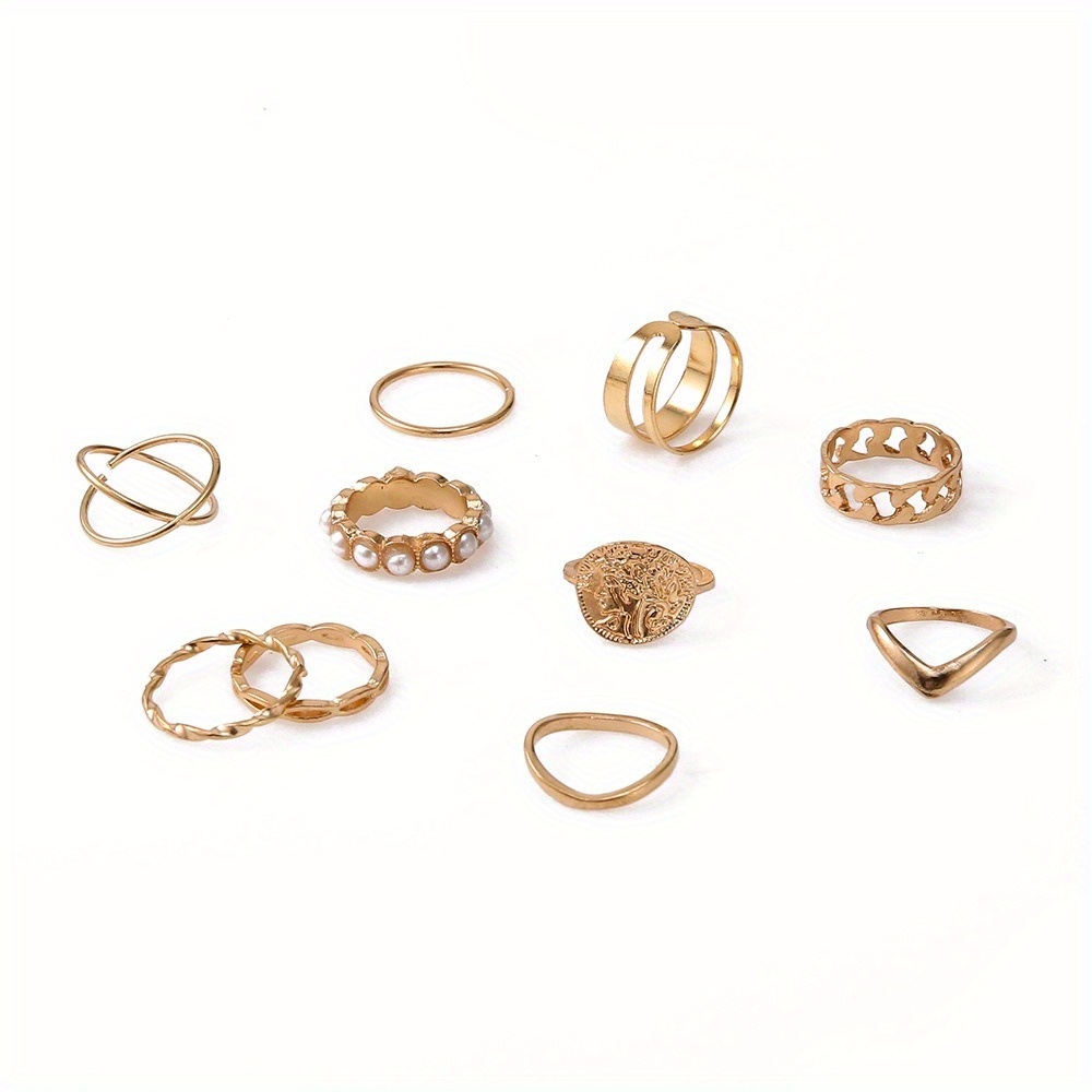 Punk Style Pearl Ring Set 10-piece Gold, Hollow Open Ring