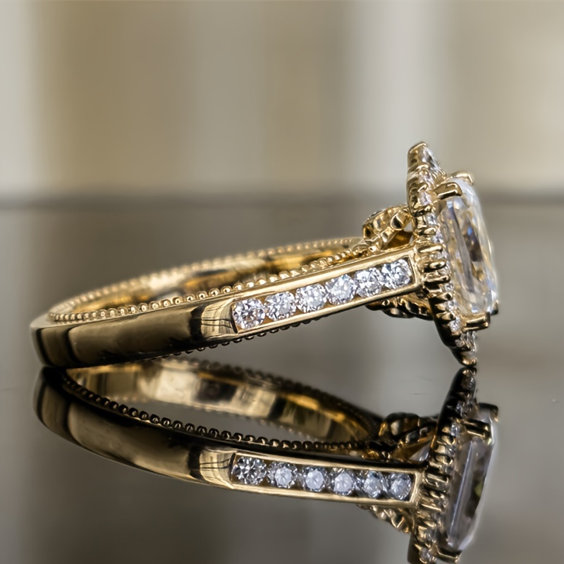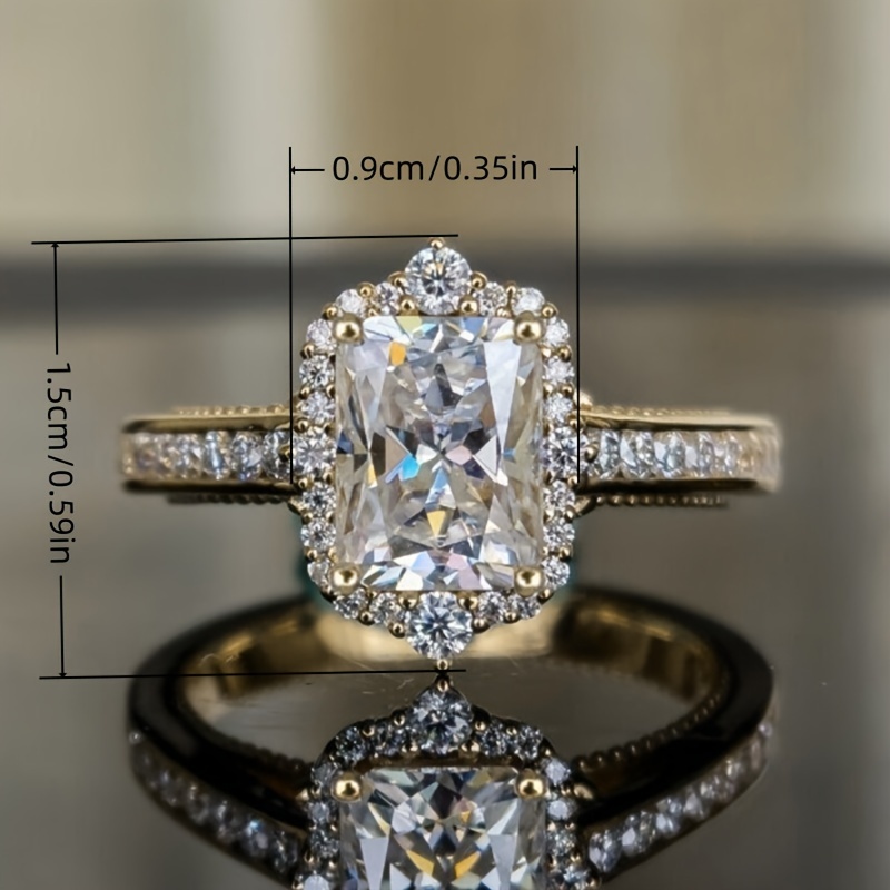 Rectangle Zircon Engagement Ring, Four-claw Halo Ring, Luxury Elegant Bridal Wedding Jewelry, Ladies Engagement and Anniversary Ring, Gold Tone, Elegant Style