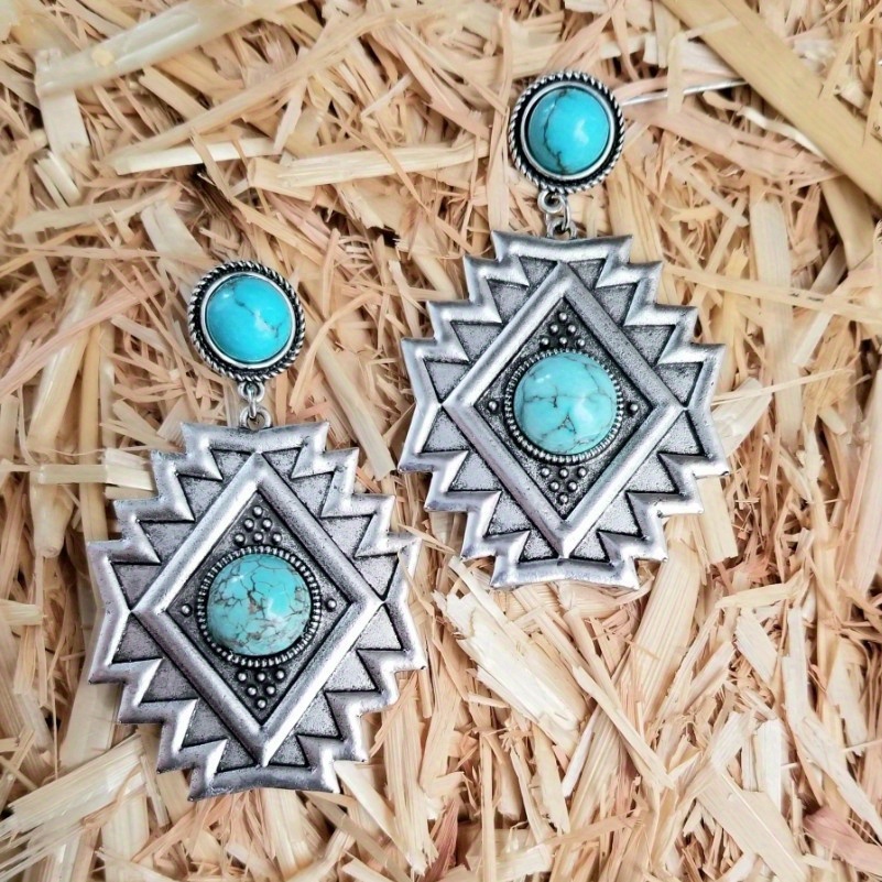 Retro engraved geometric shape with round turquoise inlaid pendant earrings, retro ethnic style alloy jewelry, exquisite Women's gift