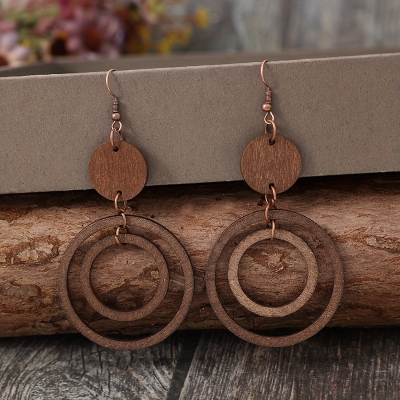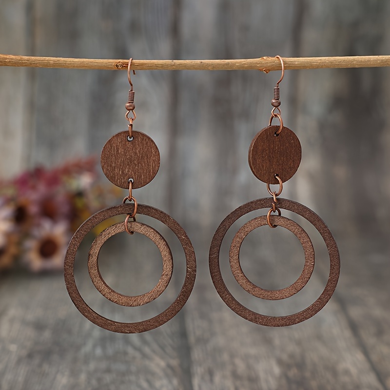 Retro hollow round pendant earrings elegant simple style wooden jewelry fashion women's earrings