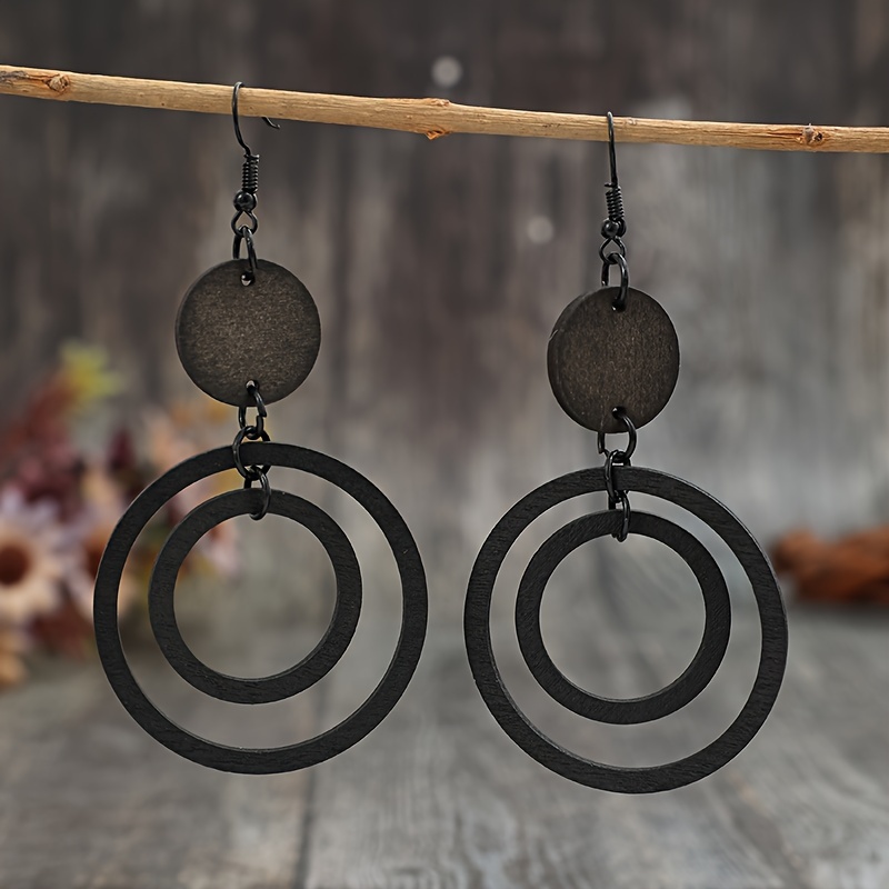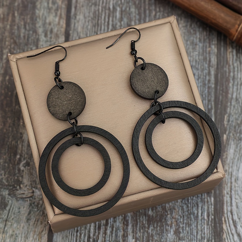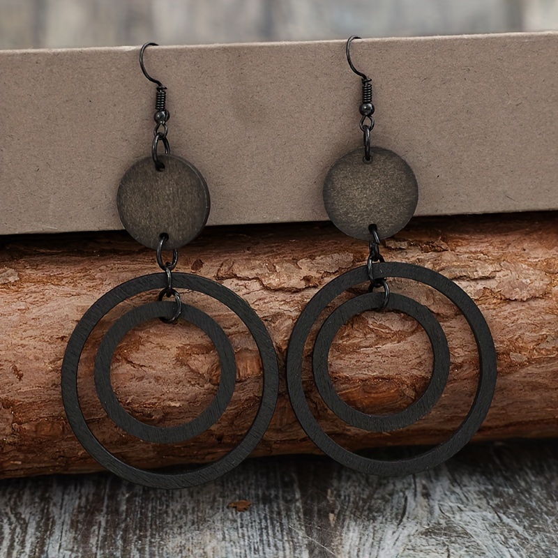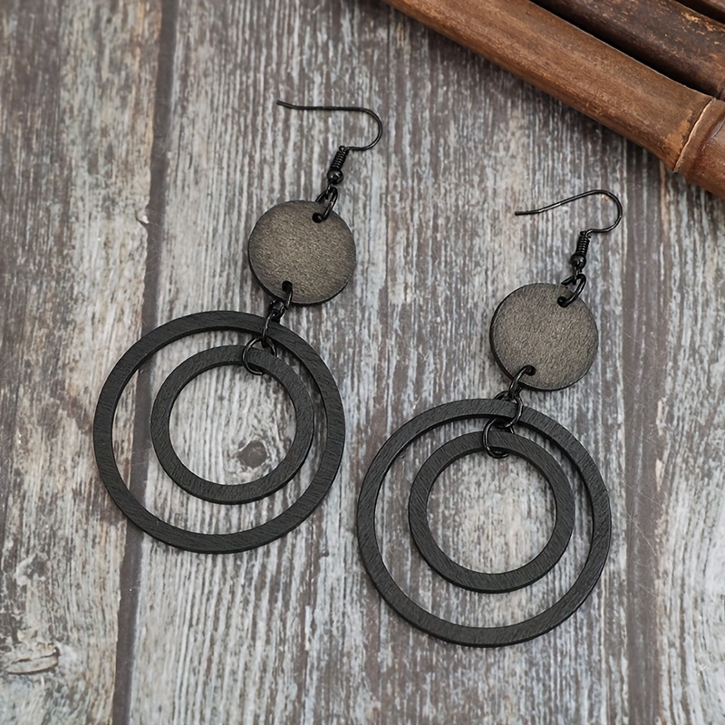 Retro style wooden pendant earrings, double round design, iron ear hooks, no plating, chic handmade wooden fashion accessories, suitable for daily wear - all seasons compatible