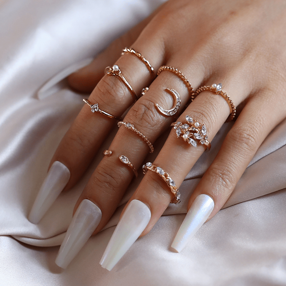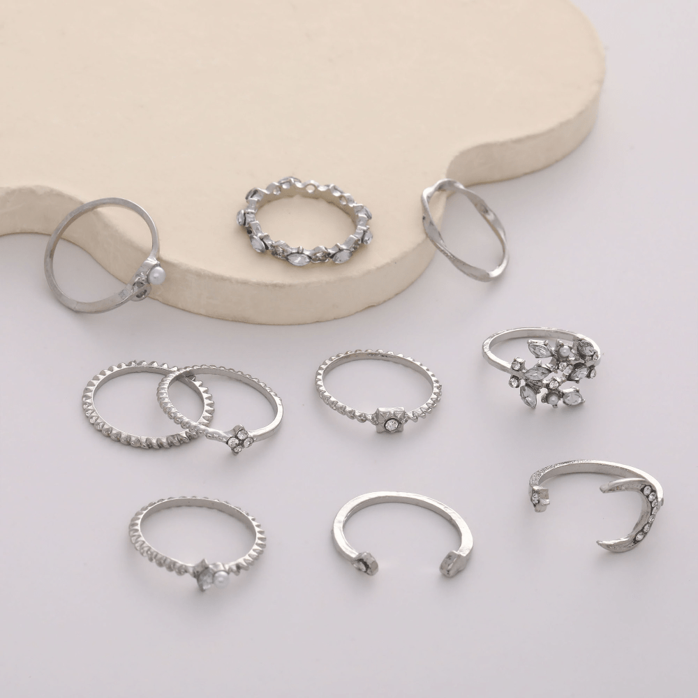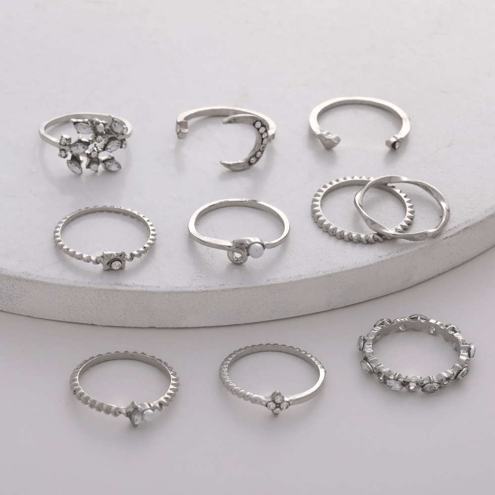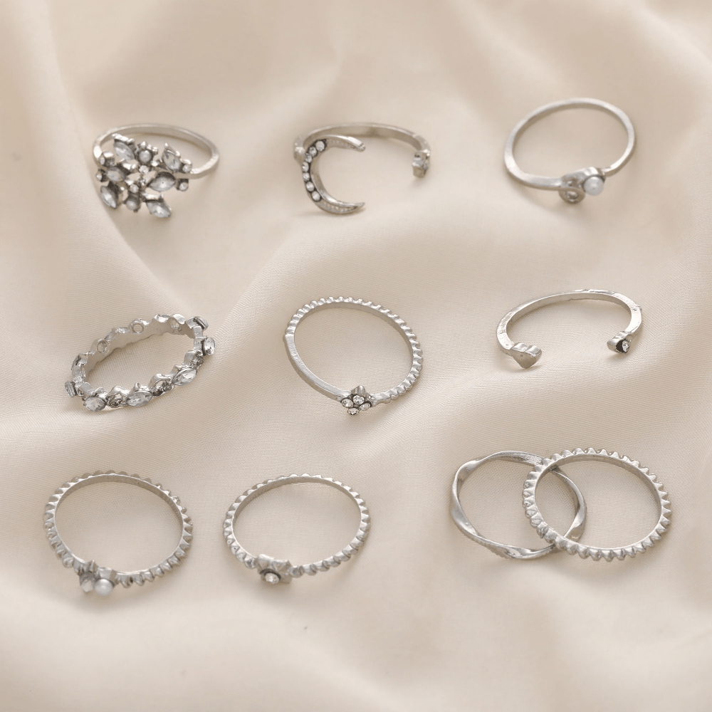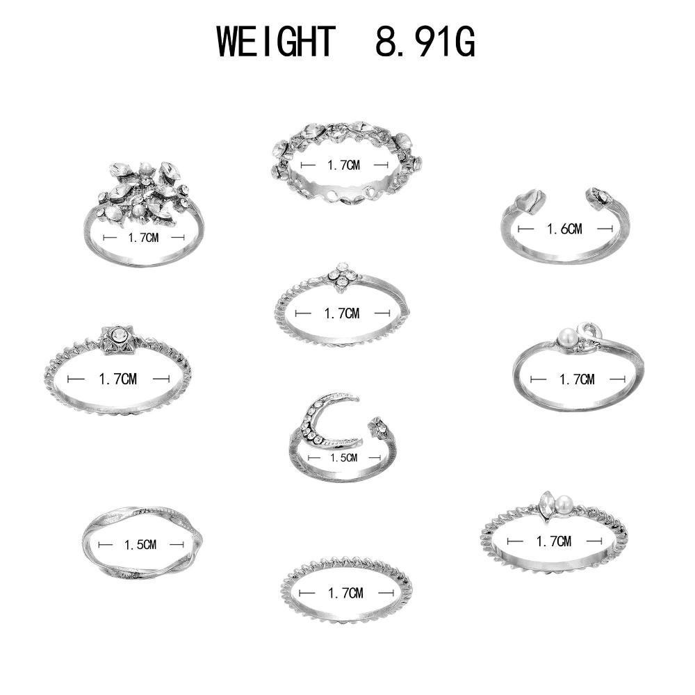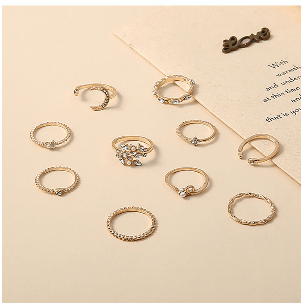 Ring Set 10 Pack Moon Star Leaf Love Rhinestone Joint Ring Set