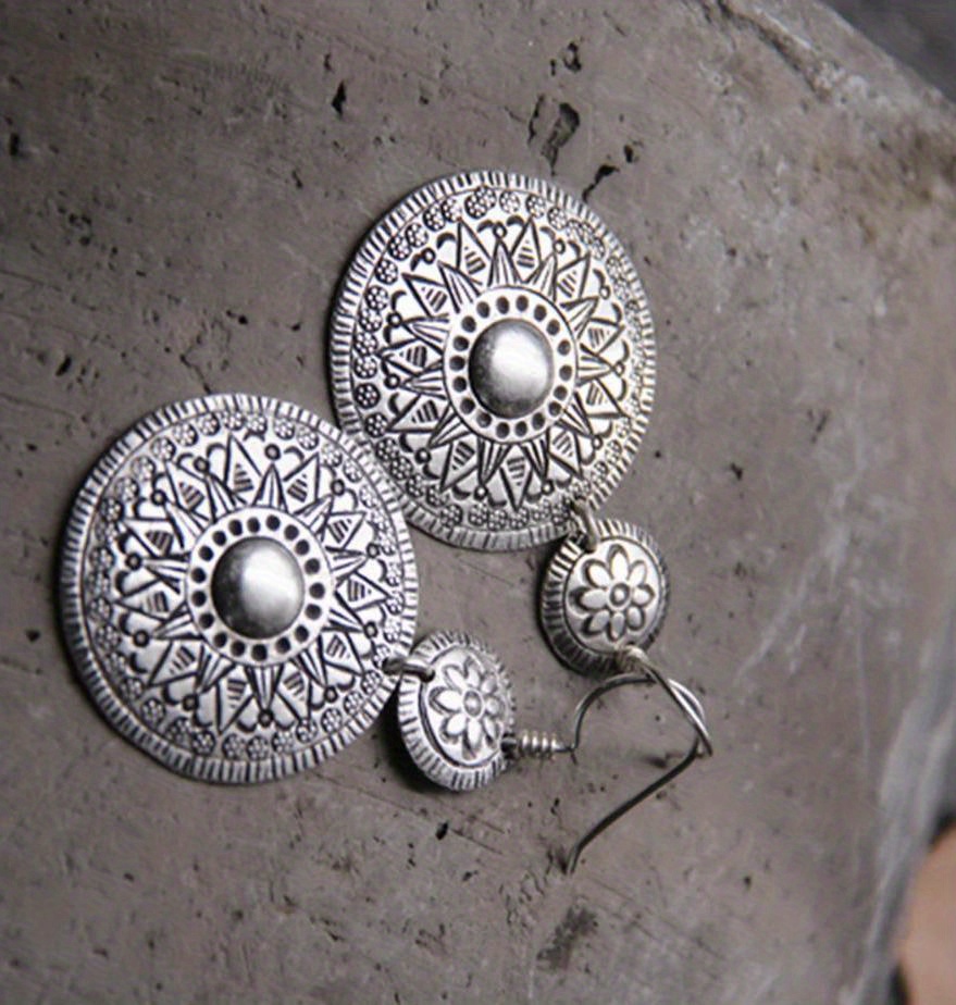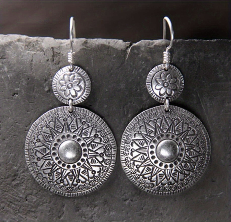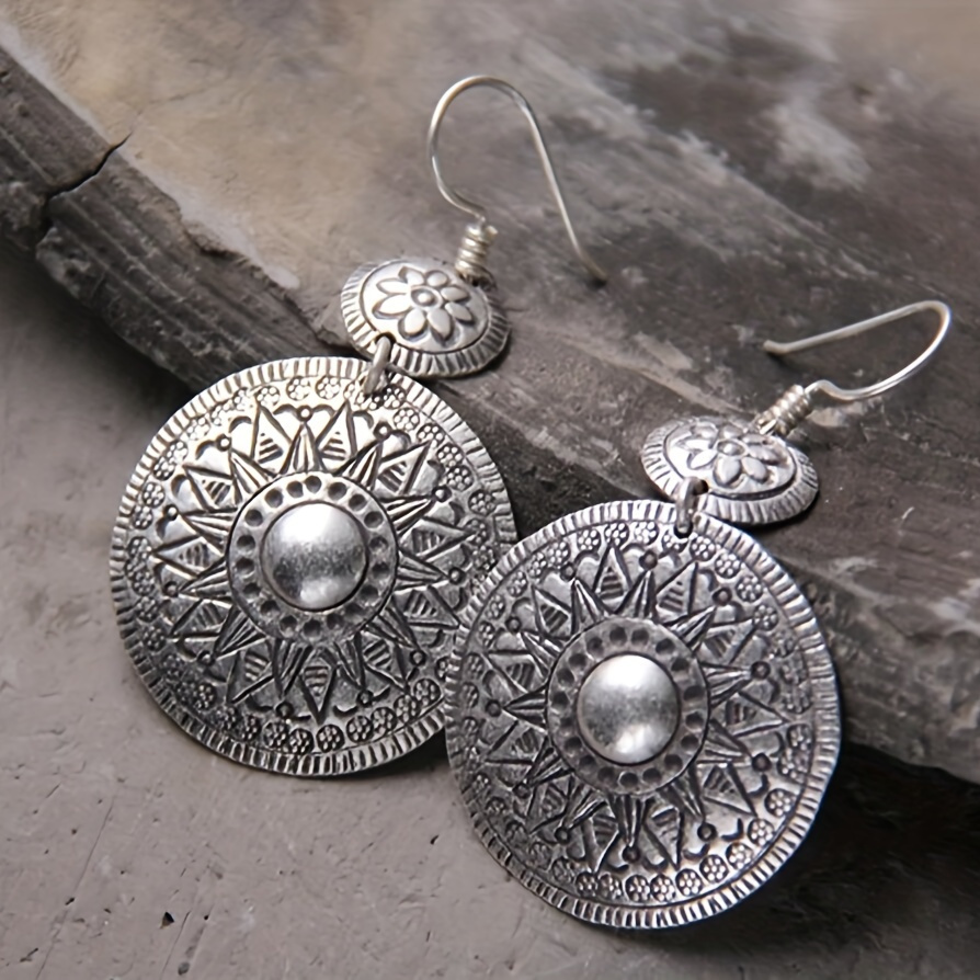 Silver round engraved pendant earrings, retro ethnic style alloy silver-plated jewelry, fashionable women's gifts