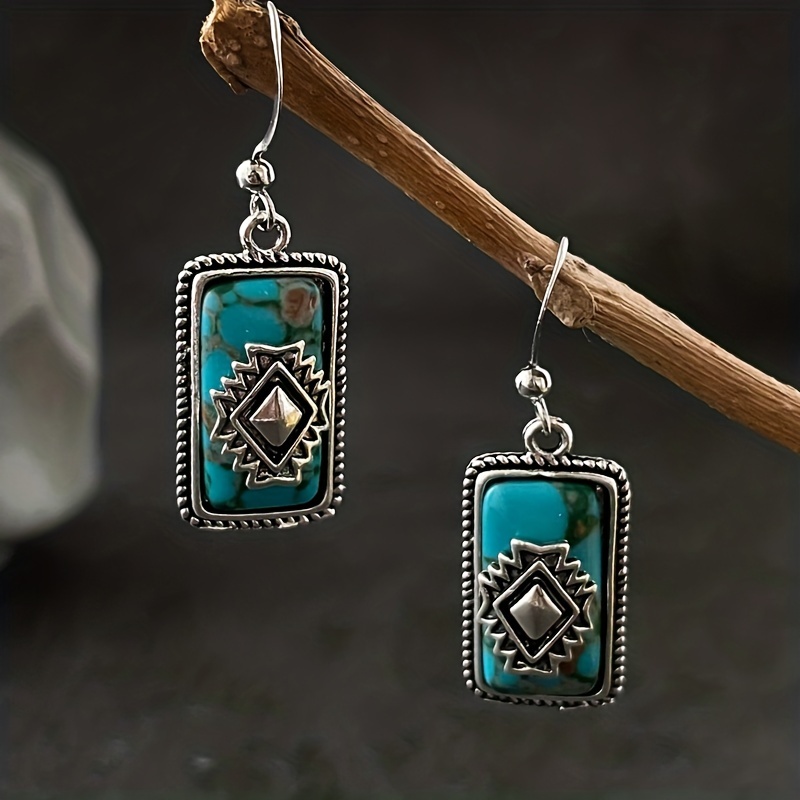 Square Turquoise Pendant Earrings Vintage Bohemian Ethnic Temperament Zinc Alloy Synthetic Gemstone 925 Silver Plated Material Party Engagement Female Gift