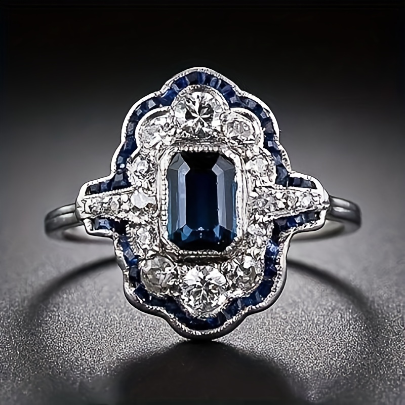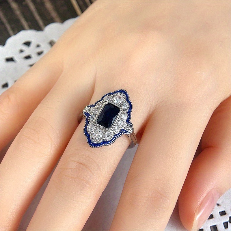 Stylish Zirconia micro-set vintage lace set with blue gemstone ring, elegant ladies engagement anniversary gift jewelry