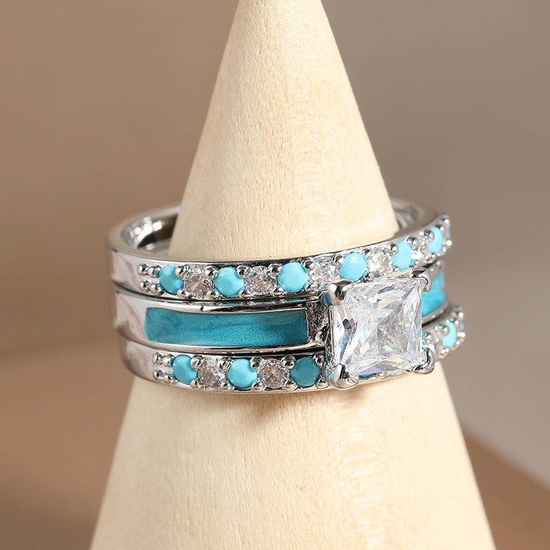 Vintage Bohemian Bridal Ring Set - 925 Silver Copper Plated, Square Zirconia and Green Gemstones, 3 Piece Engagement and Wedding Jewelry Set, Perfect for Christmas and Year-Round Gifts