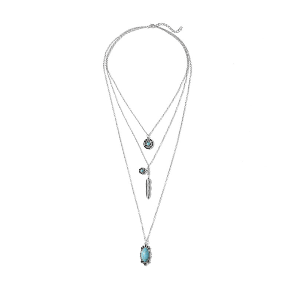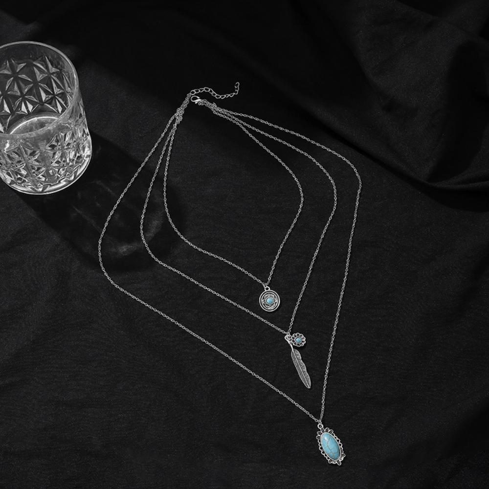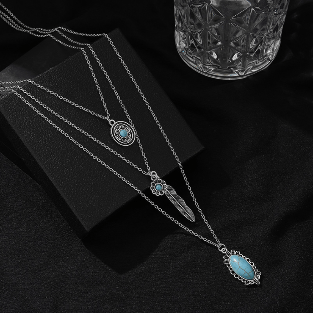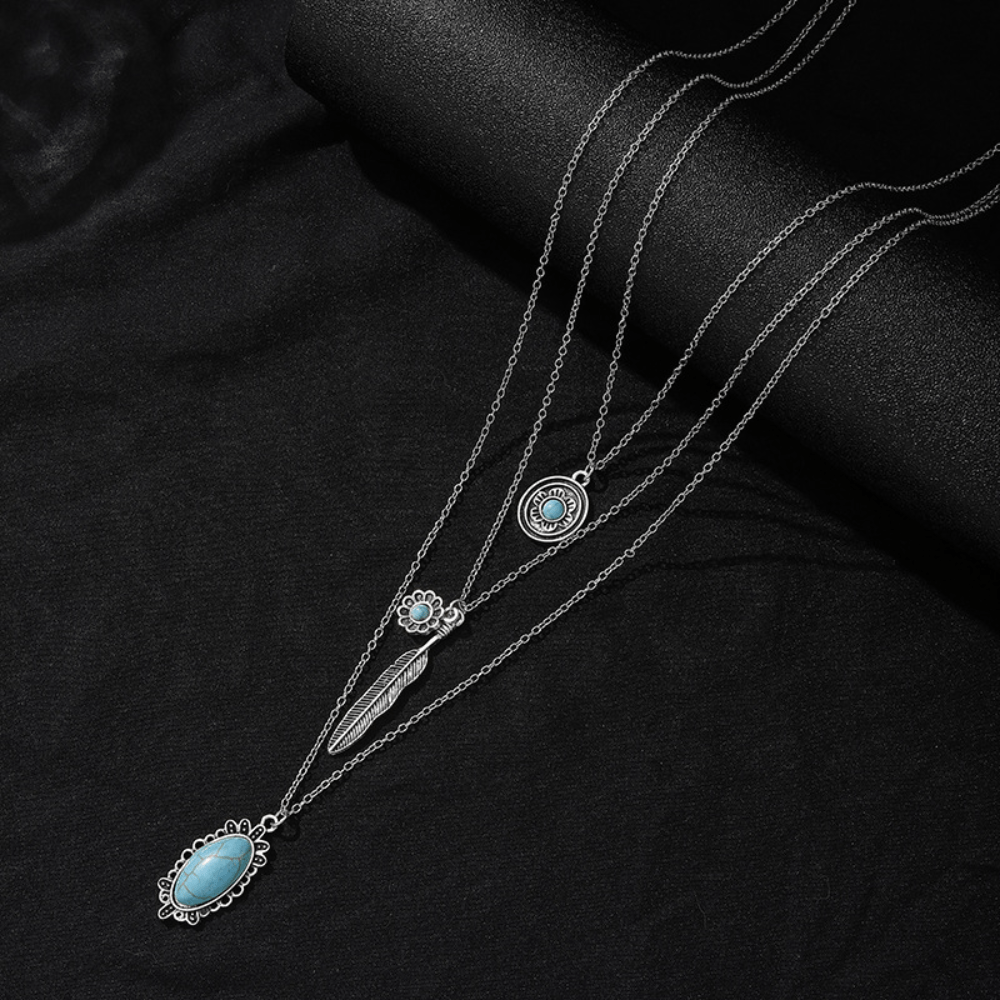 Vintage Bohemian Turquoise Feather Carved 3-Layer Necklace