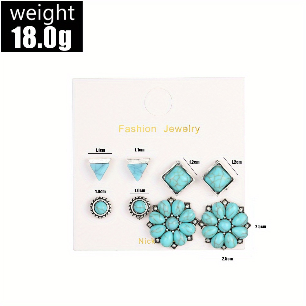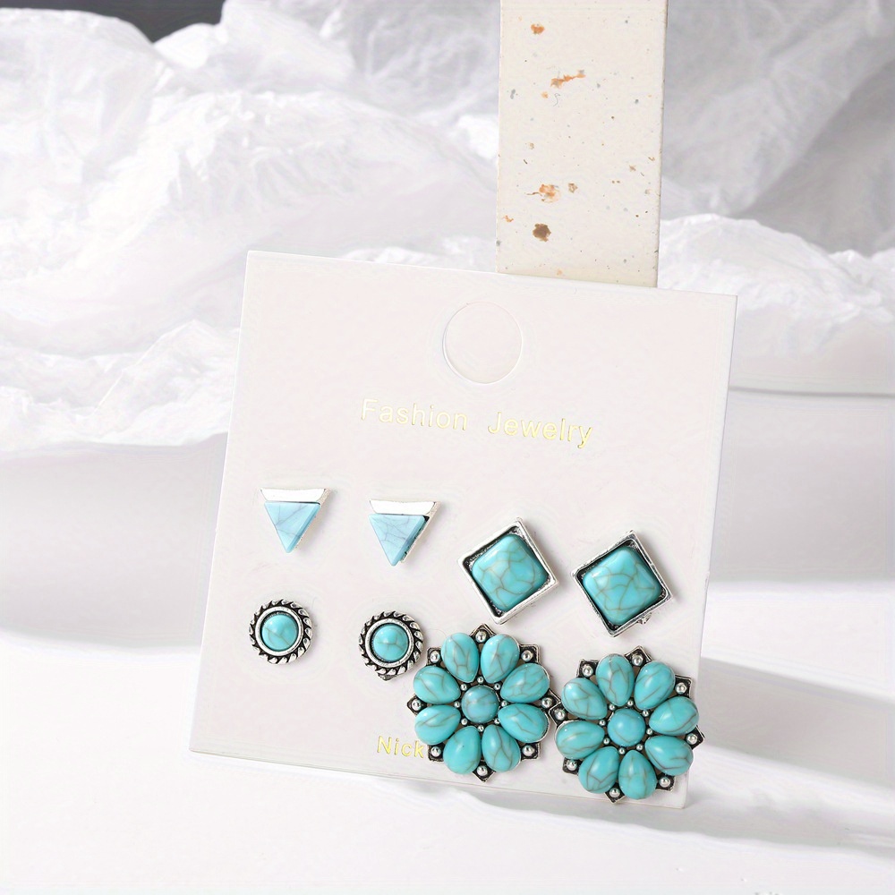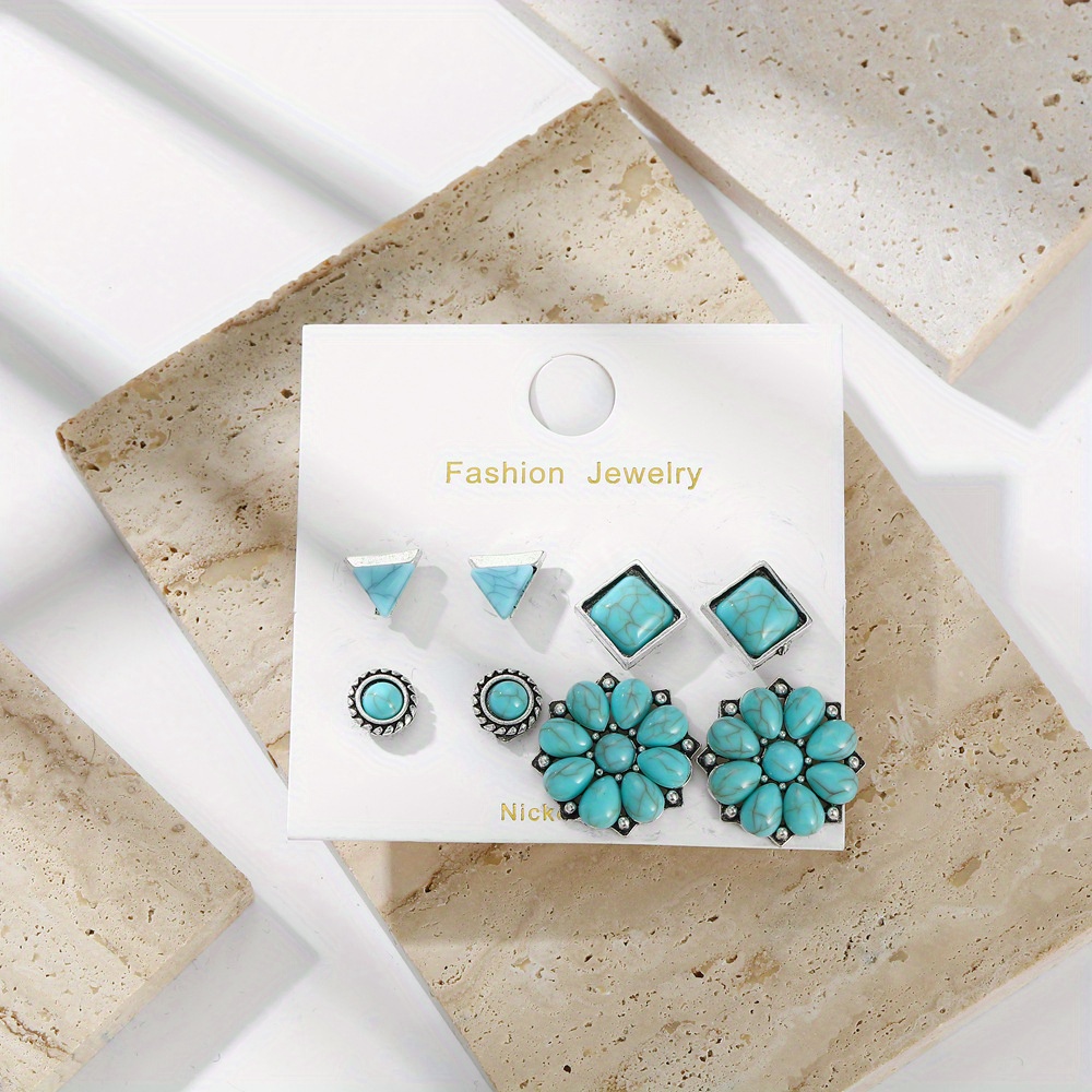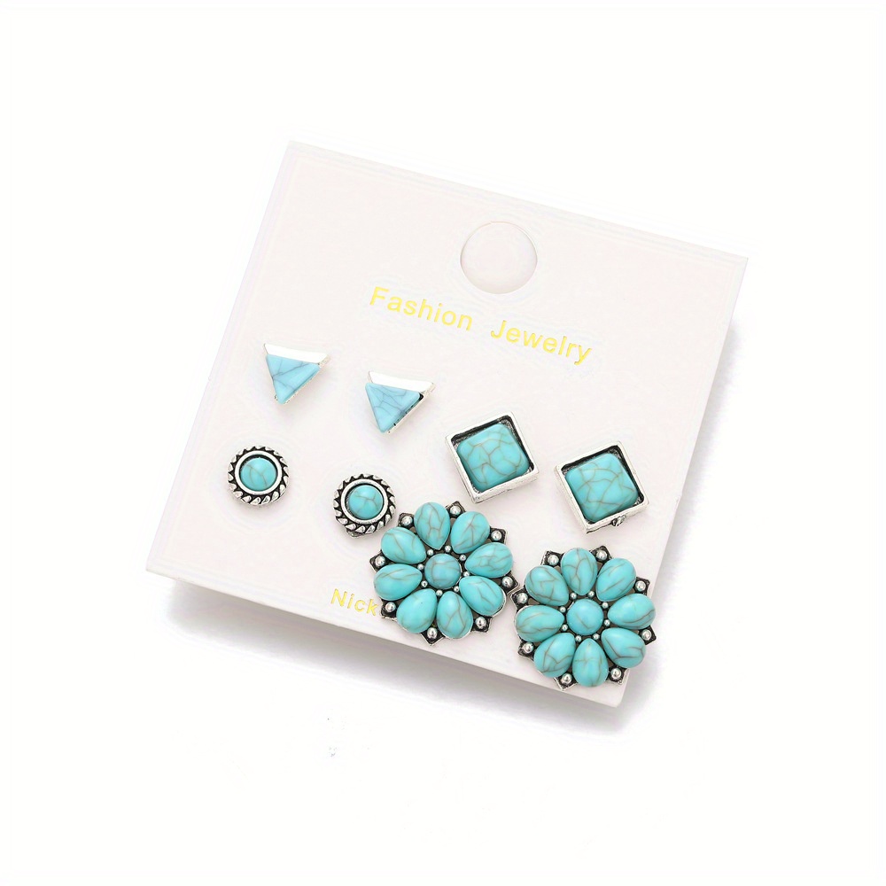 Vintage Bohemian Turquoise Floral Geometric Round Earrings 4 Pair Set