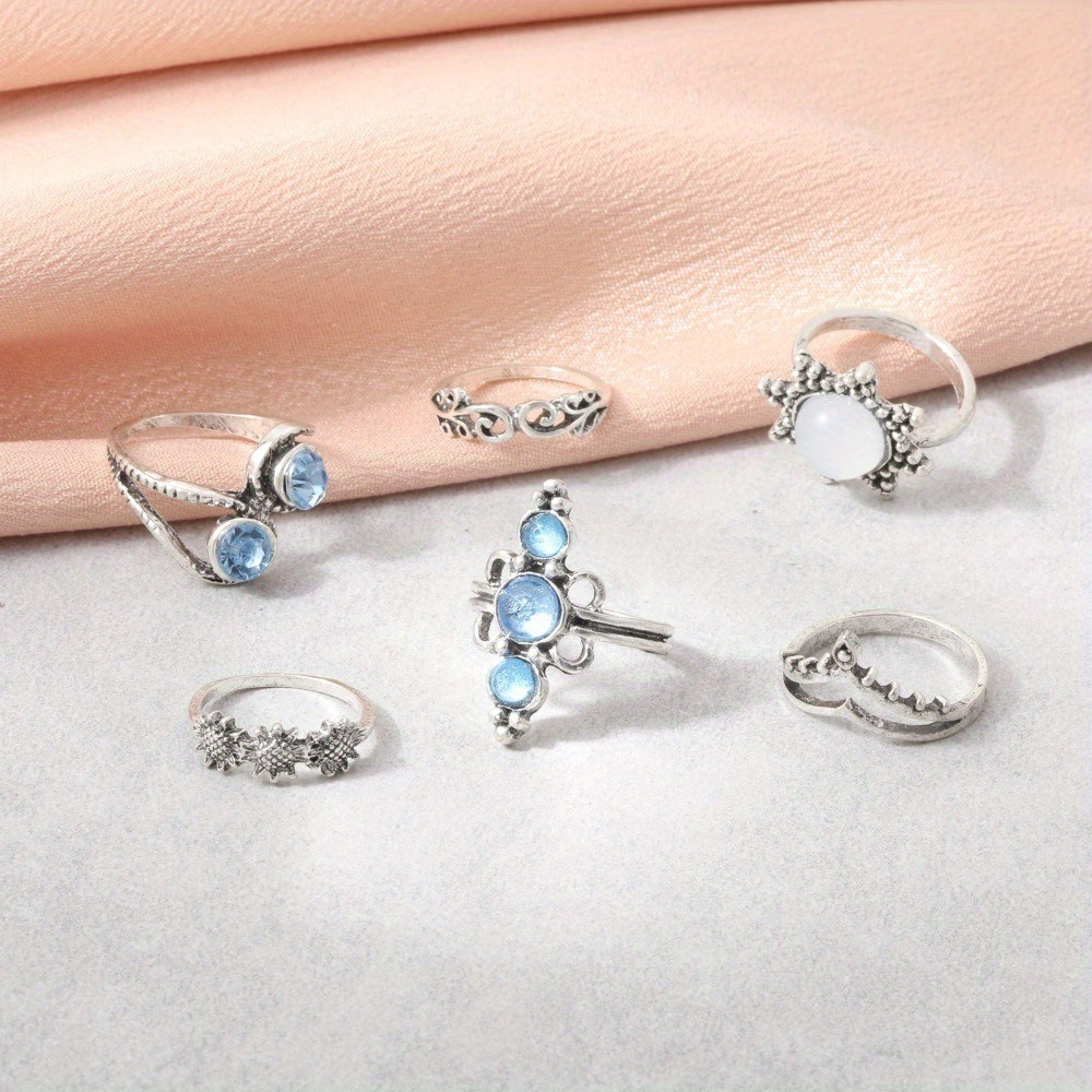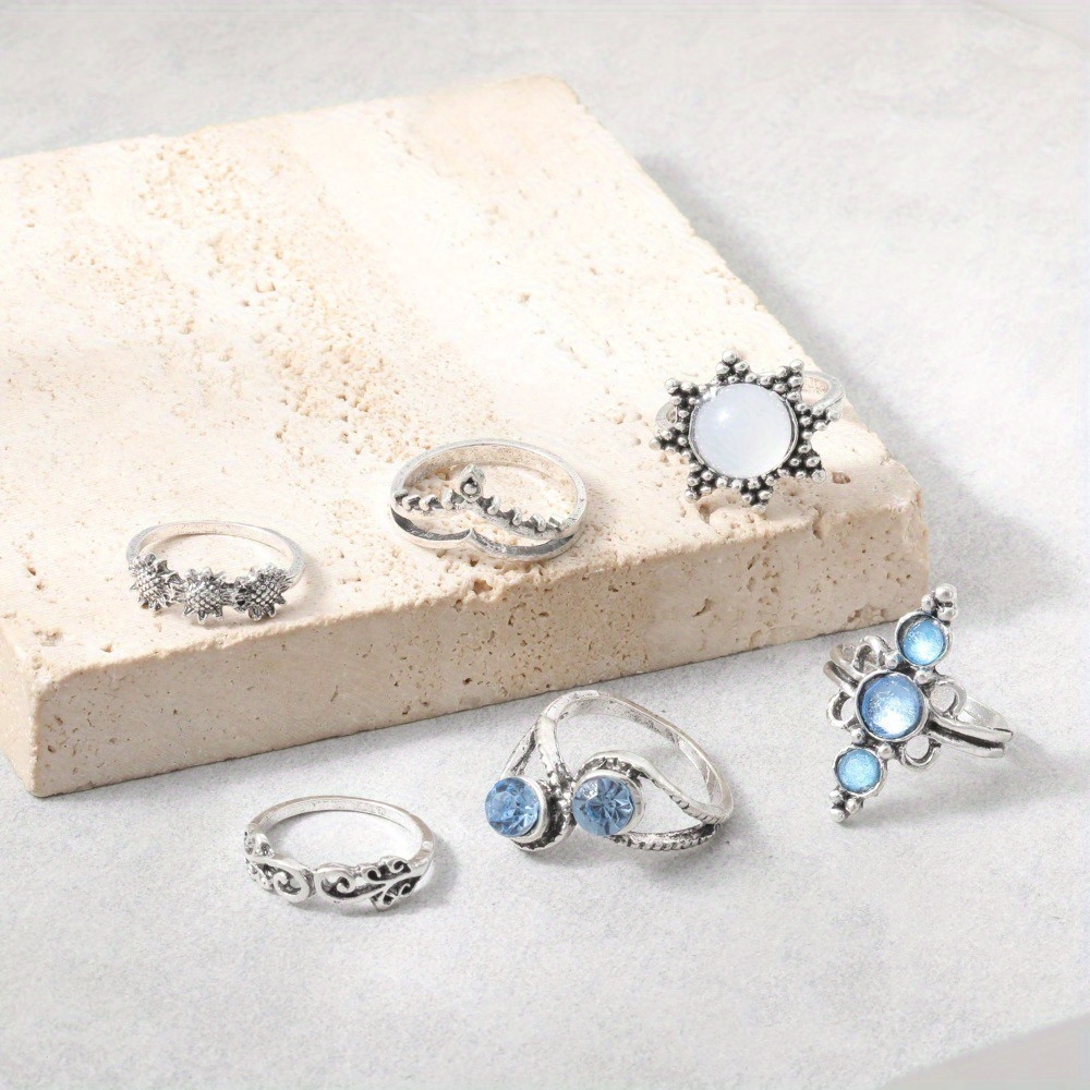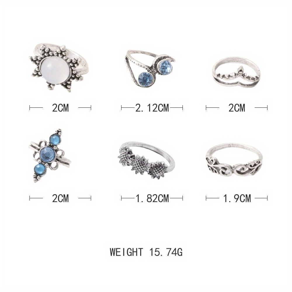 Vintage Diamond Engraved Crown Starry Sky Gemstone, Sunflower 6-piece Combination Set Ring