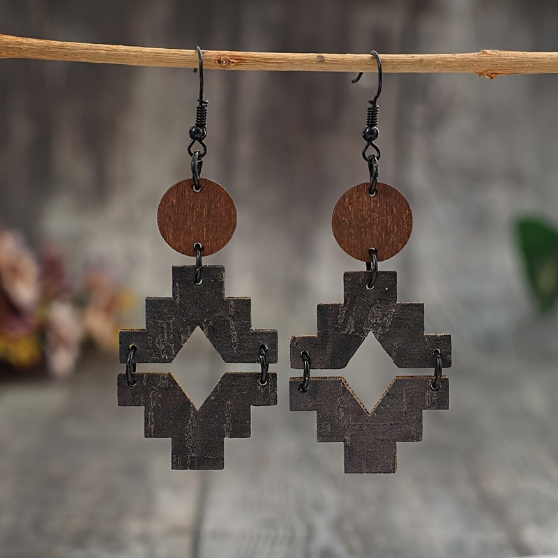 Vintage geometric pattern wooden pendant earrings with iron ear hooks, vintage distressed southwest style pendant earrings for Casual Attire - compatible with all seasons