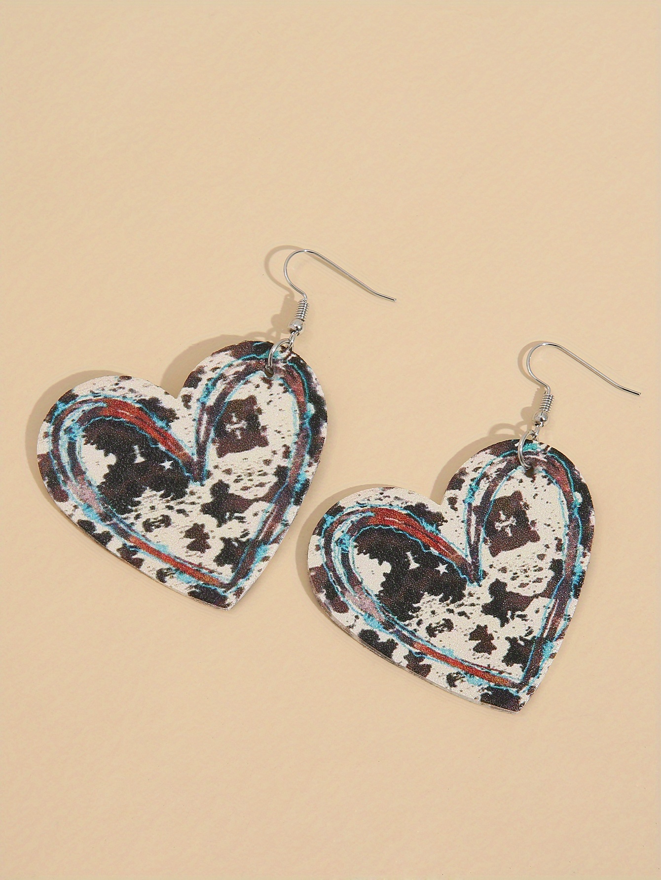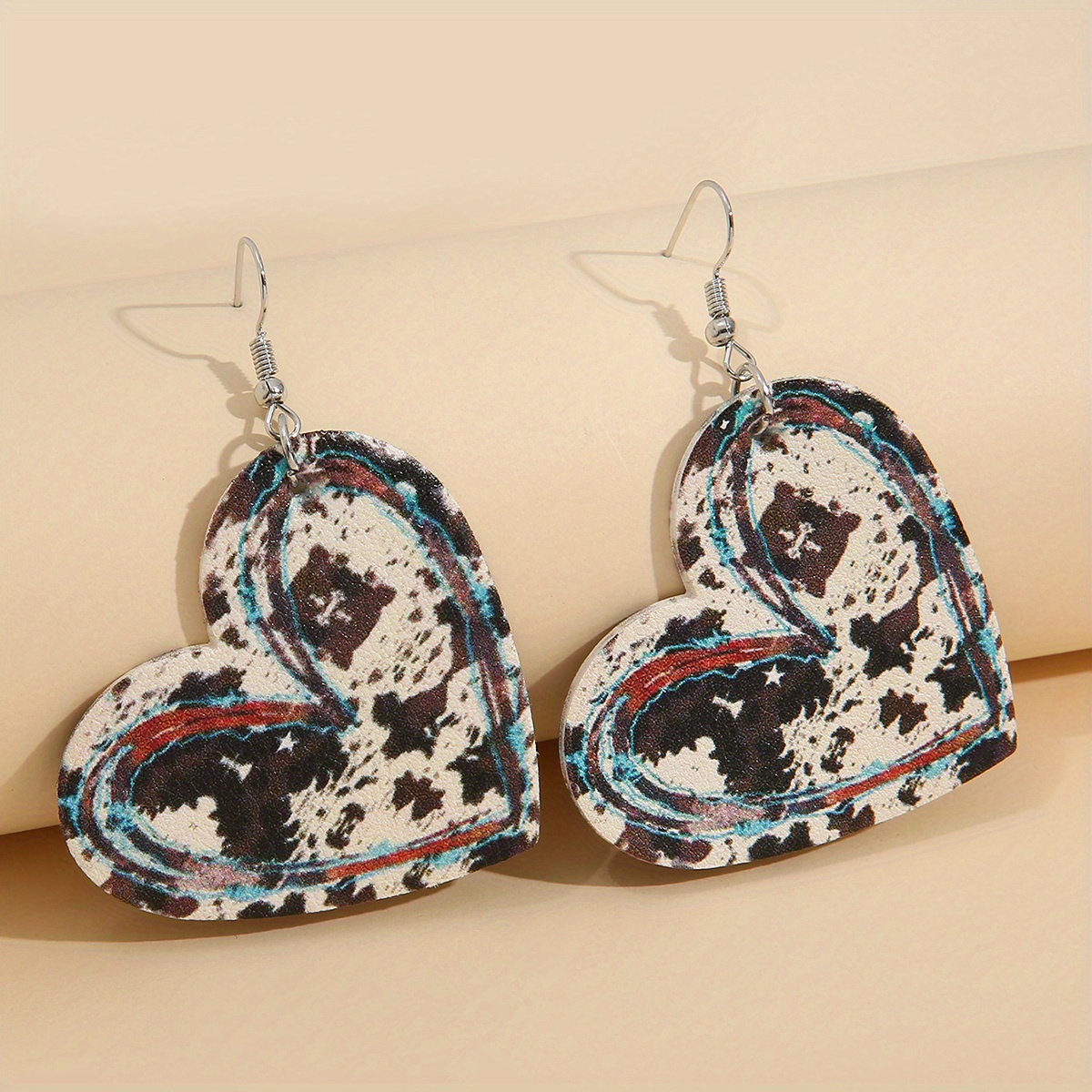 Vintage Heart-Shaped Cow Pattern Pendant Earrings Vintage Western PU Leather Jewelry Fashion Holiday Earrings