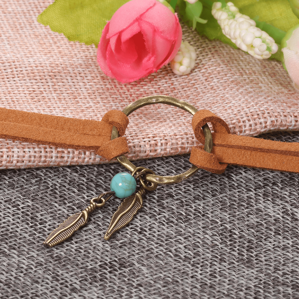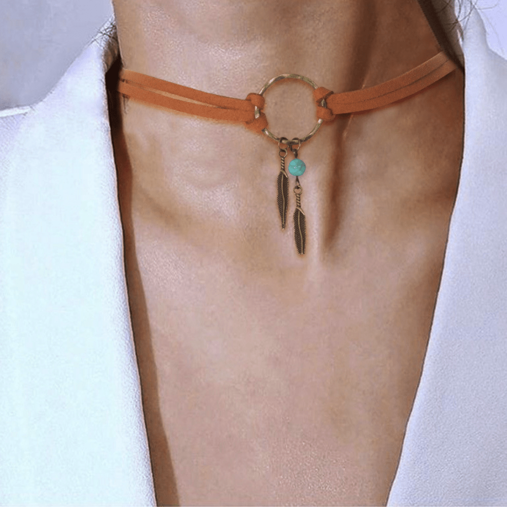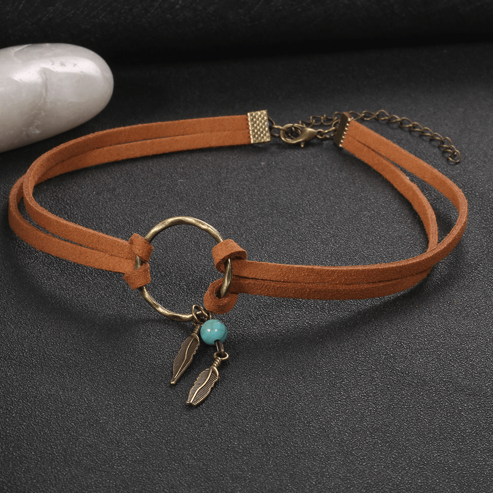 Vintage necklace choker vintage bronze leaf pendant leather geometric ring clavicle chain