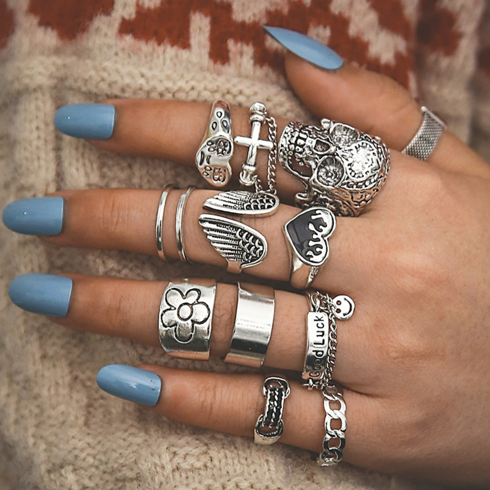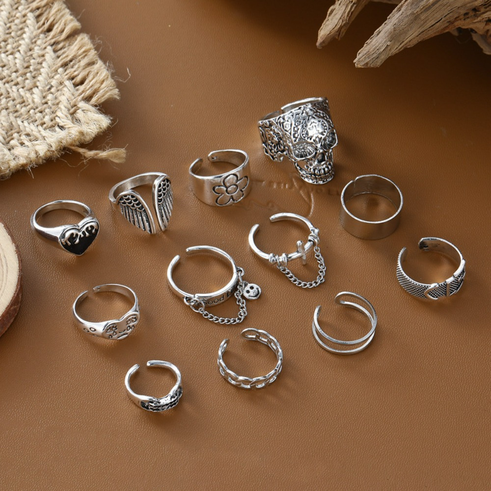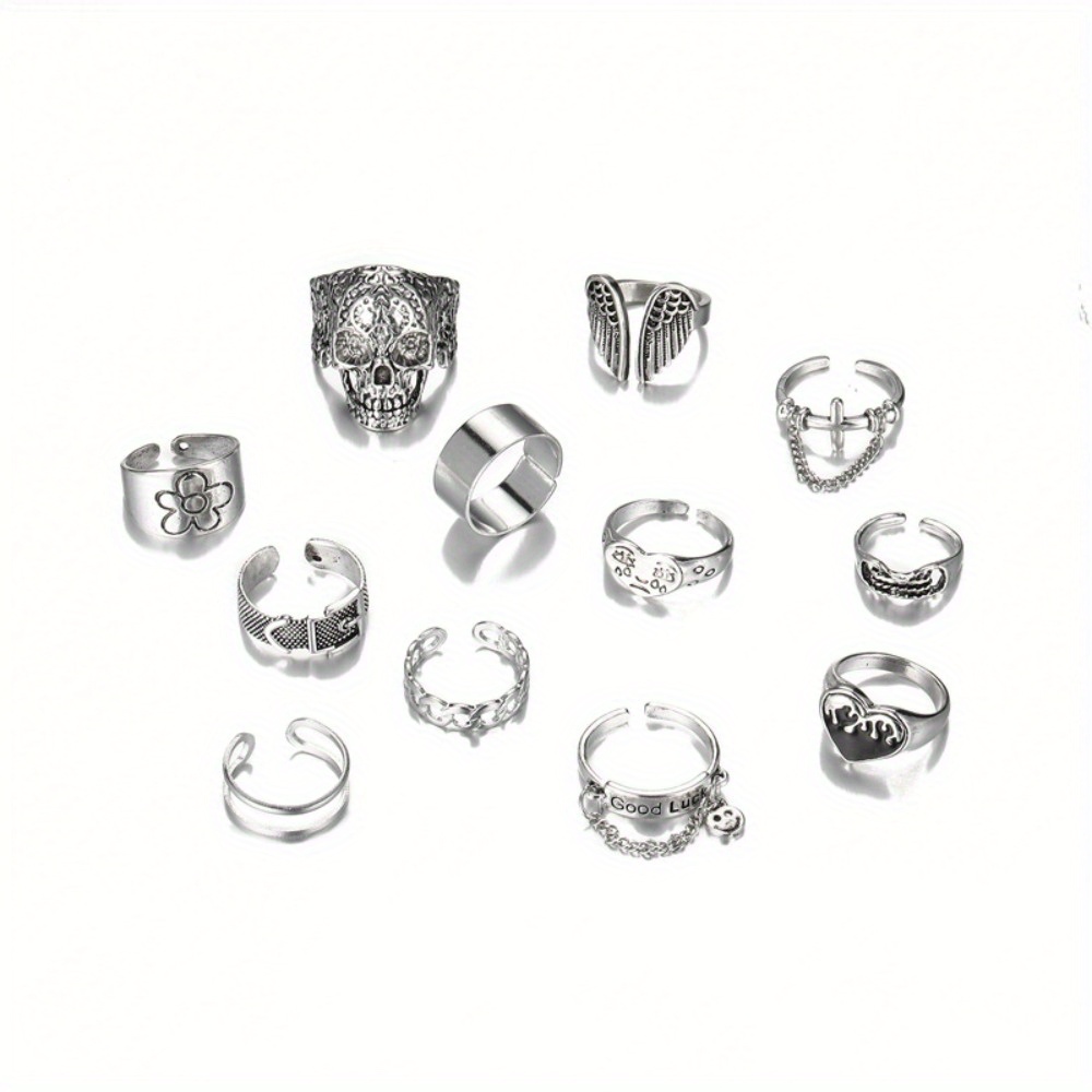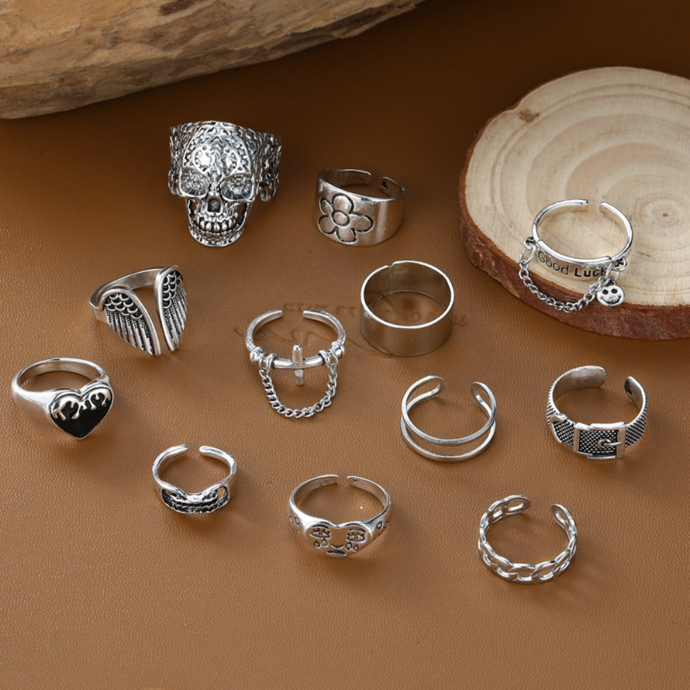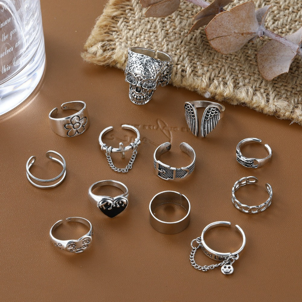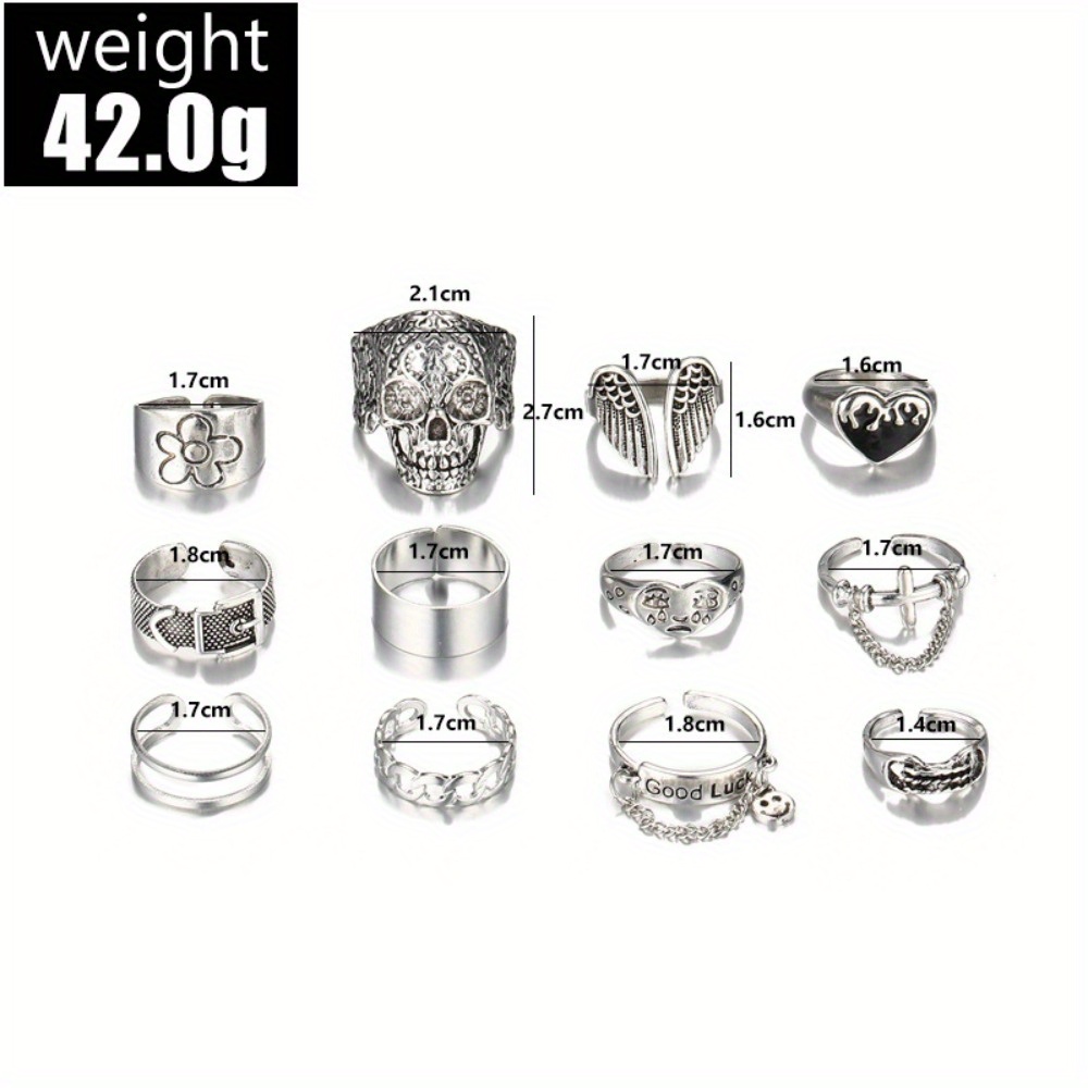 Vintage skull animal ring exaggerated wings love dripping oil crying face chain 12-piece ring set