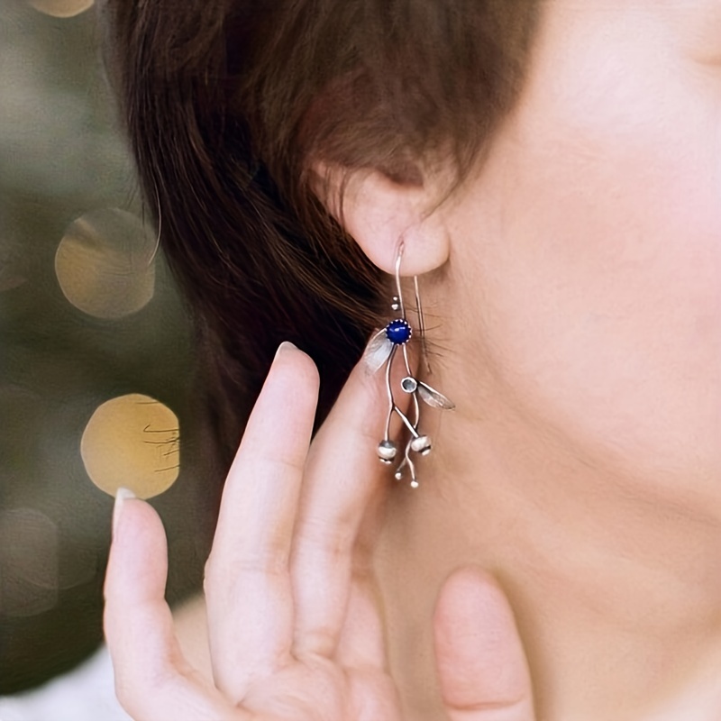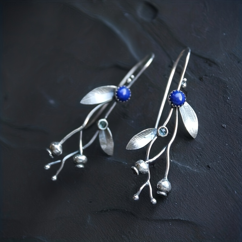Vintage style lapis lazuli and green rhinestone rattan design, ladies jewelry leaf drop earrings