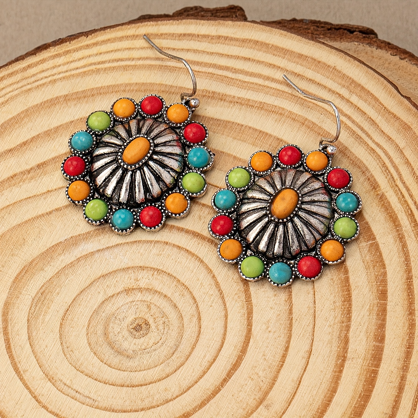 Vintage Sunflower Design Colourful Bead Inlaid Drop Earrings Bohemian Vacation Style Zinc Alloy Jewelry Travel Souvenirs