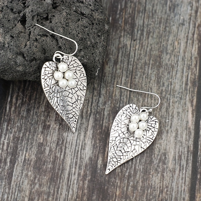 Whimsical Glow, Stylish Vintage Heart & Leaf Pendant Earrings, Accessories Imitation Pearl - Silver Plated, Zinc Alloy, Casual Wear, Whimsical Earrings